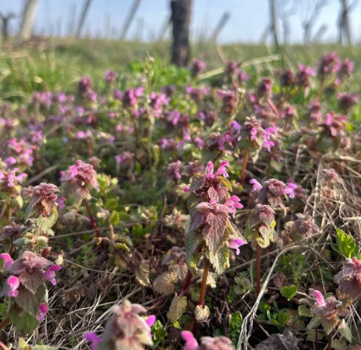 Deadnettle is the first of a season long sequence of native cover crops at Hardscrabble Vineyard. Emerging in early March, it is delicate with tiny purple flowers. If not for its precociousness it would probably be crowded out by vigorous vegetation. But right now it takes center stage. In some sections of the vineyard the ground under the vines has a lavender purple hue.